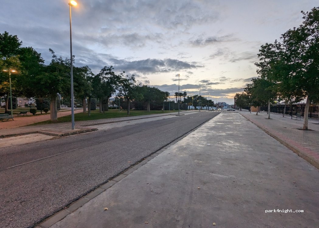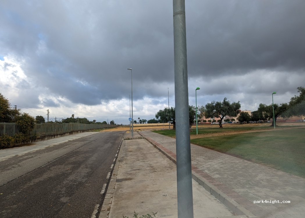 Lots of space by the evening. Perfect spot to catch the C1 train to Seville, only 30 mins away €3.60 return per person. Then get the tram T1, €1.50, one stop before the terminus is where you’ll find the cathedral. Stayed the night before the train trip, couldn’t sleep. The road is quiet enough, but the dogs! They barked all night long.