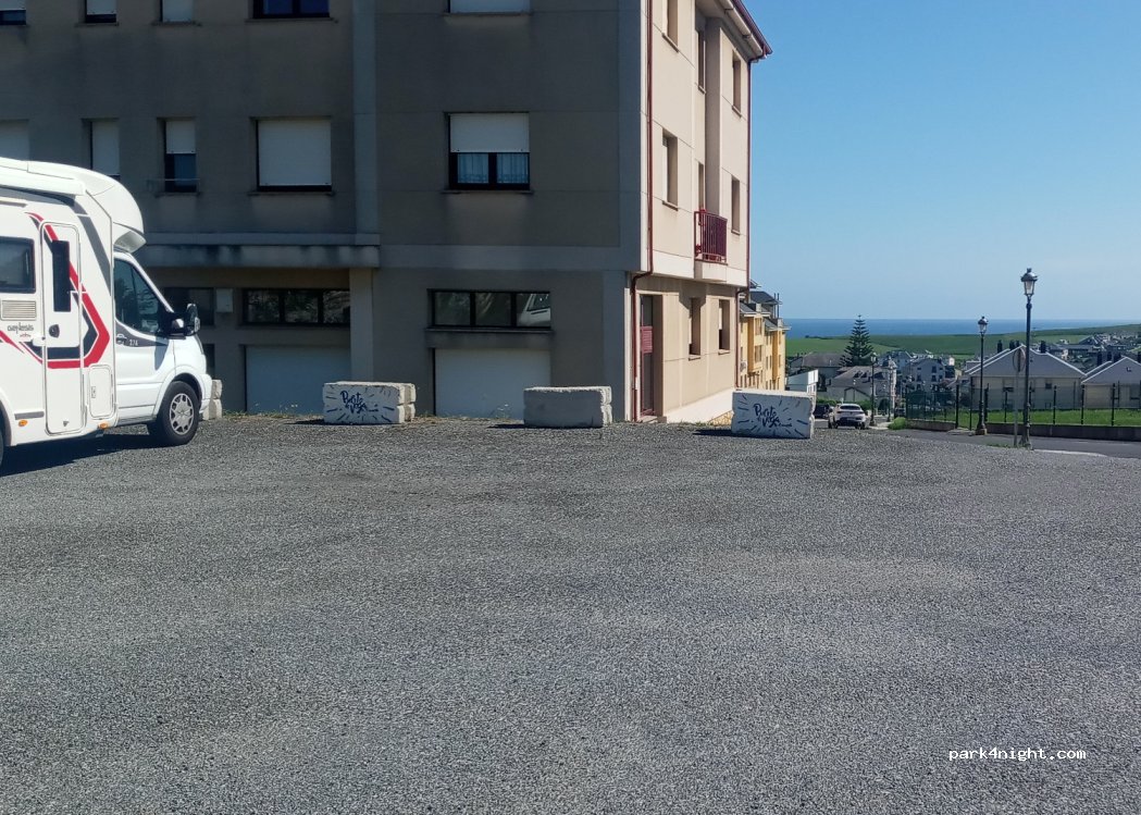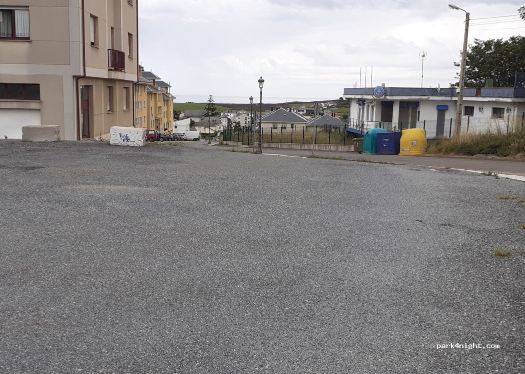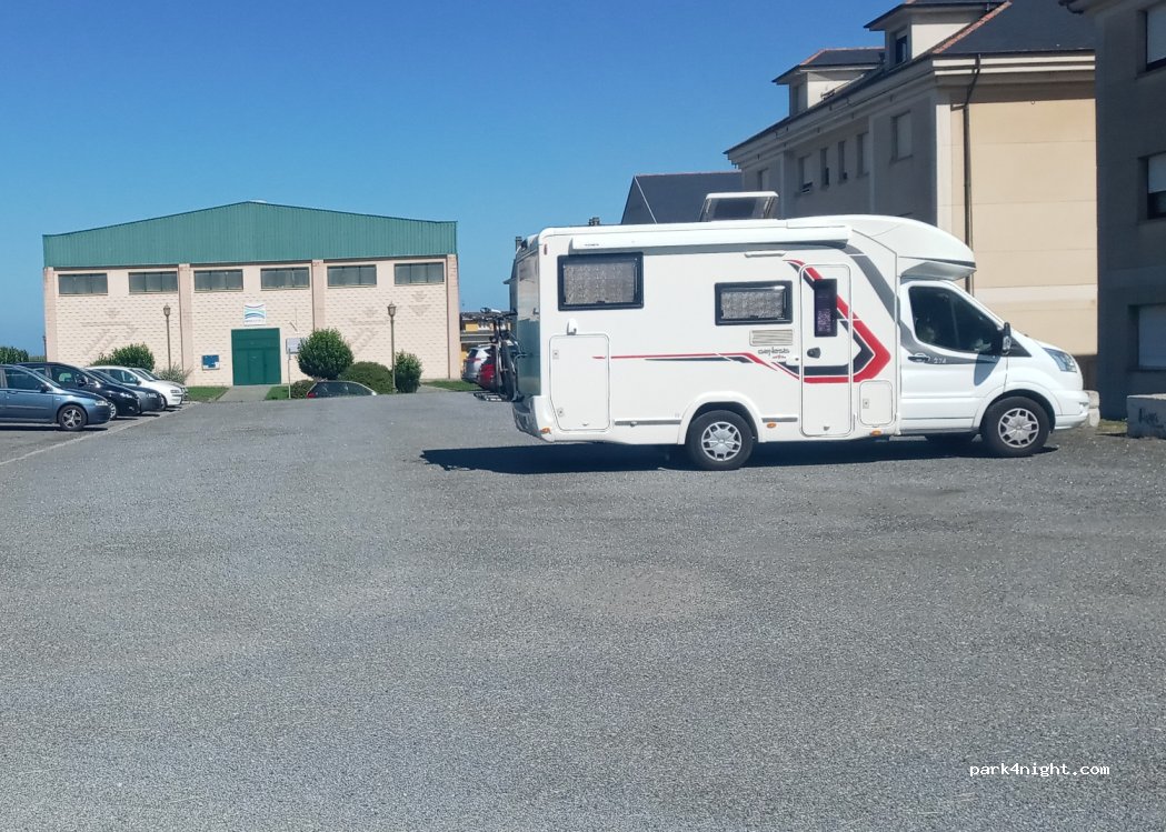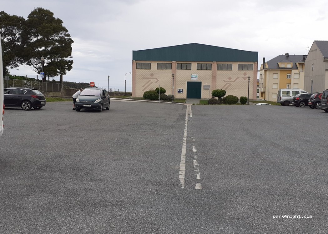 Parking del polideportivo, llano y asfaltado. Lo bonito de ésta población es el puerto, 1 km aprox, 10-15' andando. El otro parking sigue en obras debido a un derrumbre por lo que ésta alternativa es la más viable y es bastante tranquilo.