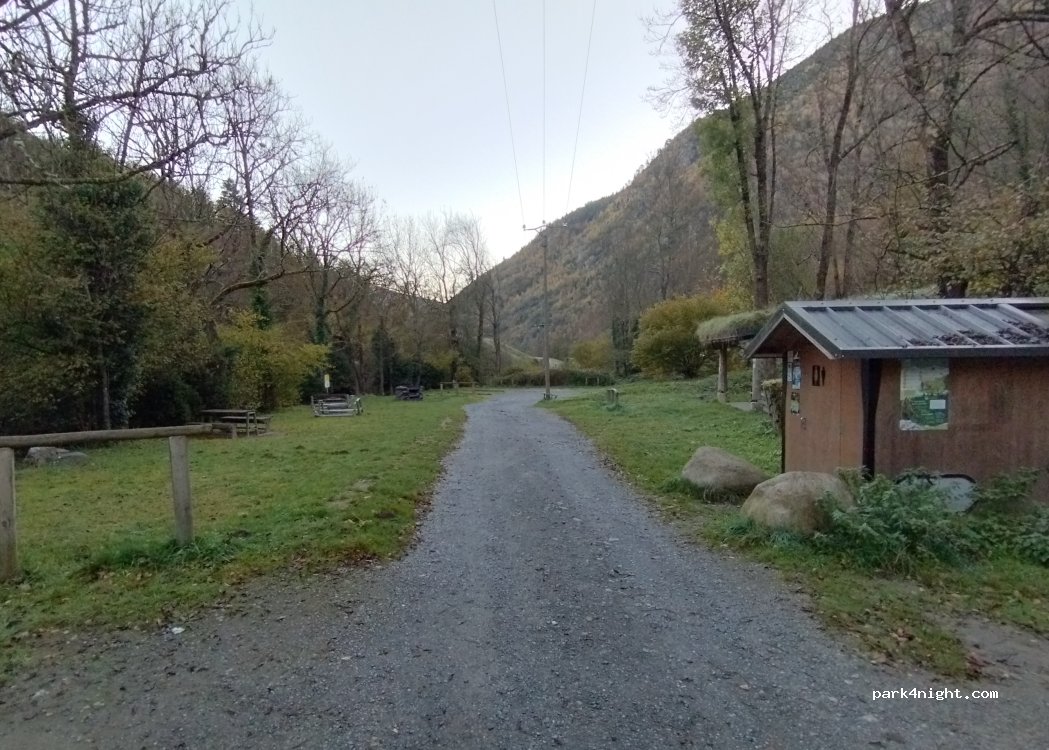Picnic area next to the road (but not too much) and the river. Night prohibited by municipal decree. There are tables and a barbecue.