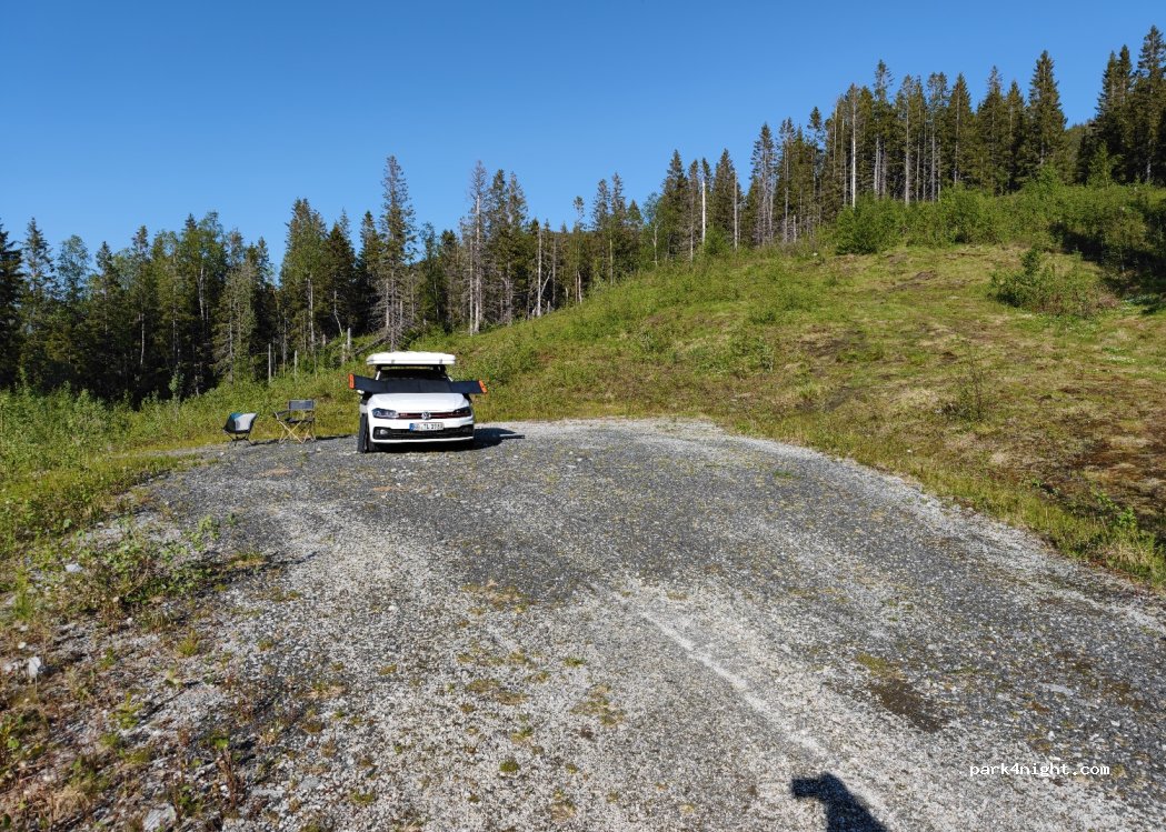 Parkplatz auf einer Anhöhe. Straße deutlich hörbar. Mit dem wohnmobiles vermutlich nicht zu erreichen, Vans sollten keine Probleme haben. Super Aussicht bis aufs Meer. Elch-Spuren und Elch-Kot vorhanden... war uns im Juni mit Dachzelt und Hund zu unsicher und wir sind nicht über die Nacht geblieben.