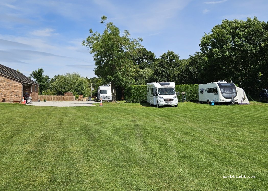 What a fabulous site. From initial enquiries with Dale to the warmest of welcomes from Julie, New Farm is a great stopover. There's a great bakery and cafe, a Castle, shops and pubs all within walking distance. The views are lovely and if the patches are too wet there are temproary parking options on car park. Julie and Dale are fabulous hosts. And only 20 minutes to Chester.
