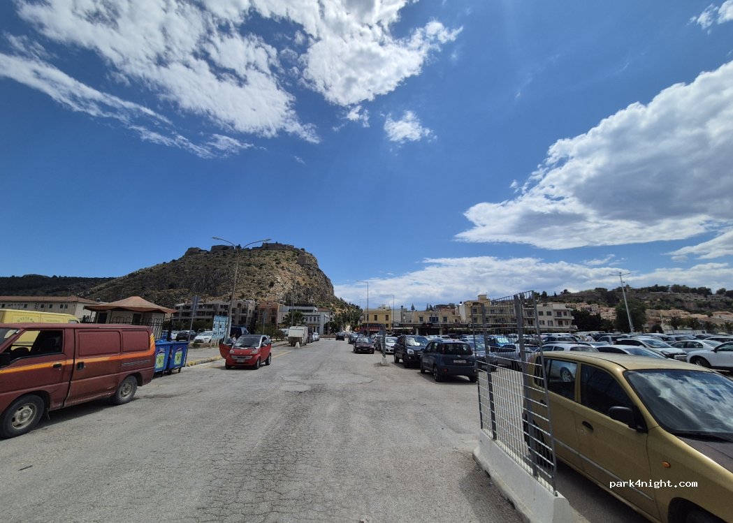 Großer Parkplatz neben dem Parkplatz direkt am Hafen. Boden gepflastert. Liegt nur wenige Gehminuten von der sehenswerten Altstadt von Nafplio entfernt. Außer Mülltonnen vor Ort, keine Entsorgung möglich. Leider liegt überall viel Müll herum.