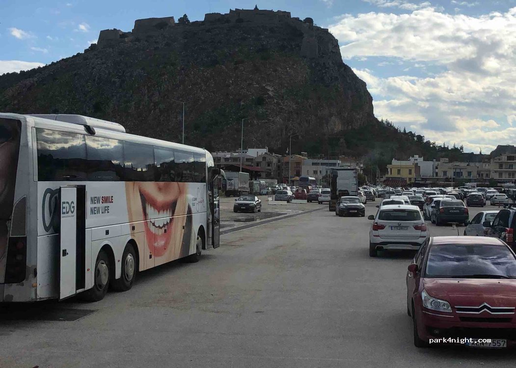 Enorme descampat al costat del parking del port de Nauplia. Al parking hi ha prohibició d’acampar i aci no hi ha cap senyal. Pots escollir pavés (un poc inclinat) o terra. No hi ha cap tipus de servei, tret dels contenidors de fem que estan mes a prop del port. A l’avinguda pots comprar pizzes per sopar.