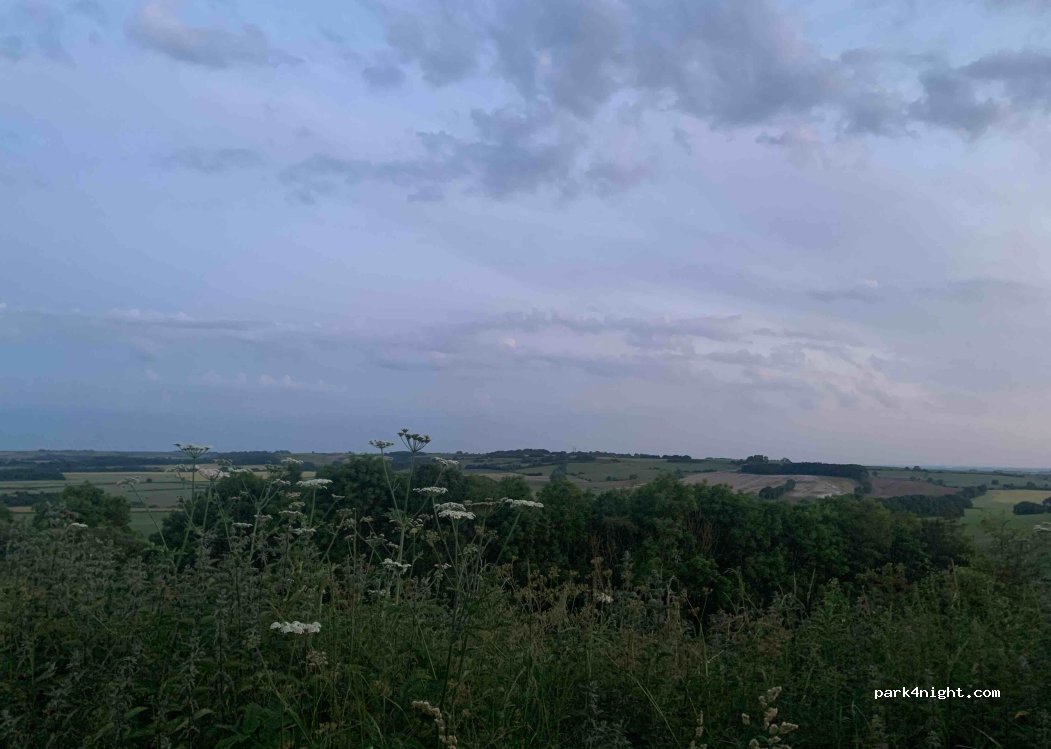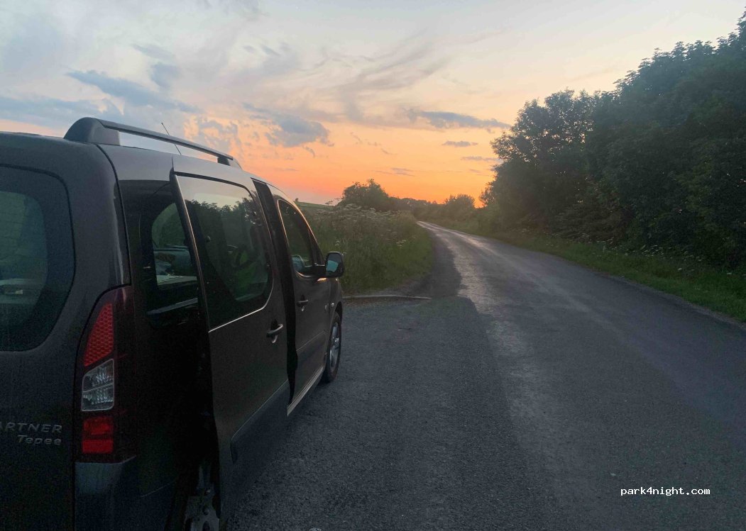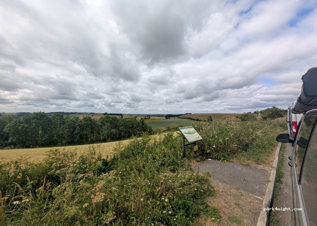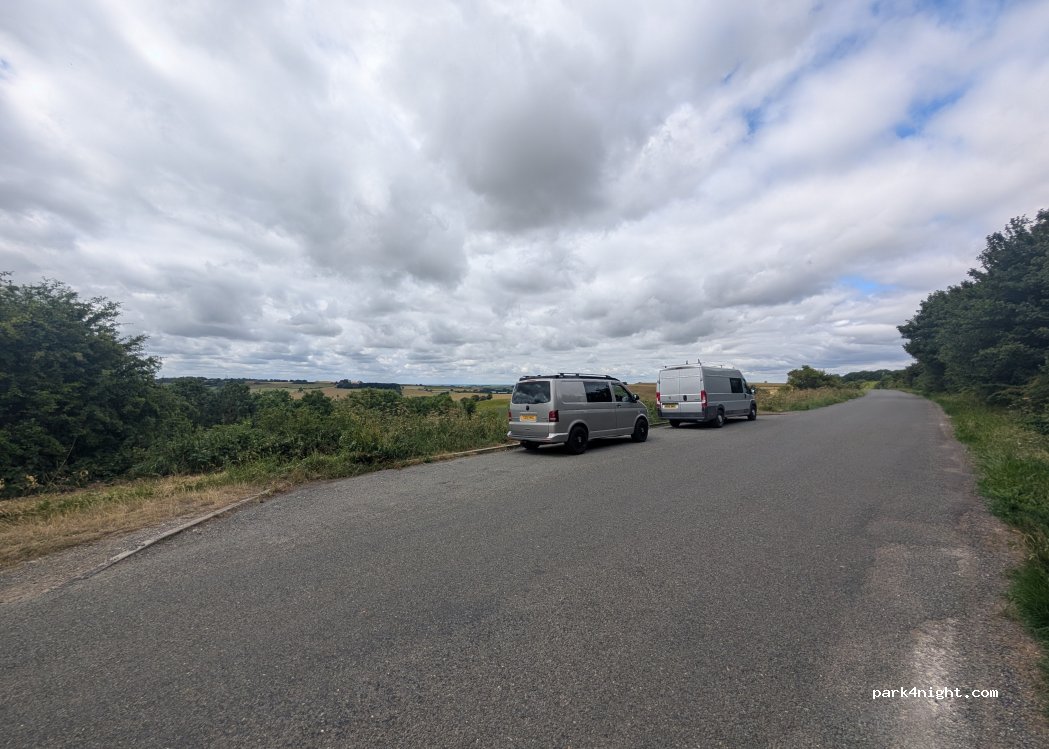 Lay-by with a view point. Tawny owl nearby, road traffic quietens down around 10pm. Panoramic vistas. Space for 2 vans.
