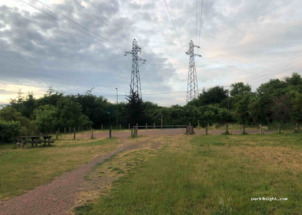 Small quiet corner with 3 picnic tables, nice view, horses, cows, sound of frogs. Busy road and railway right next to it