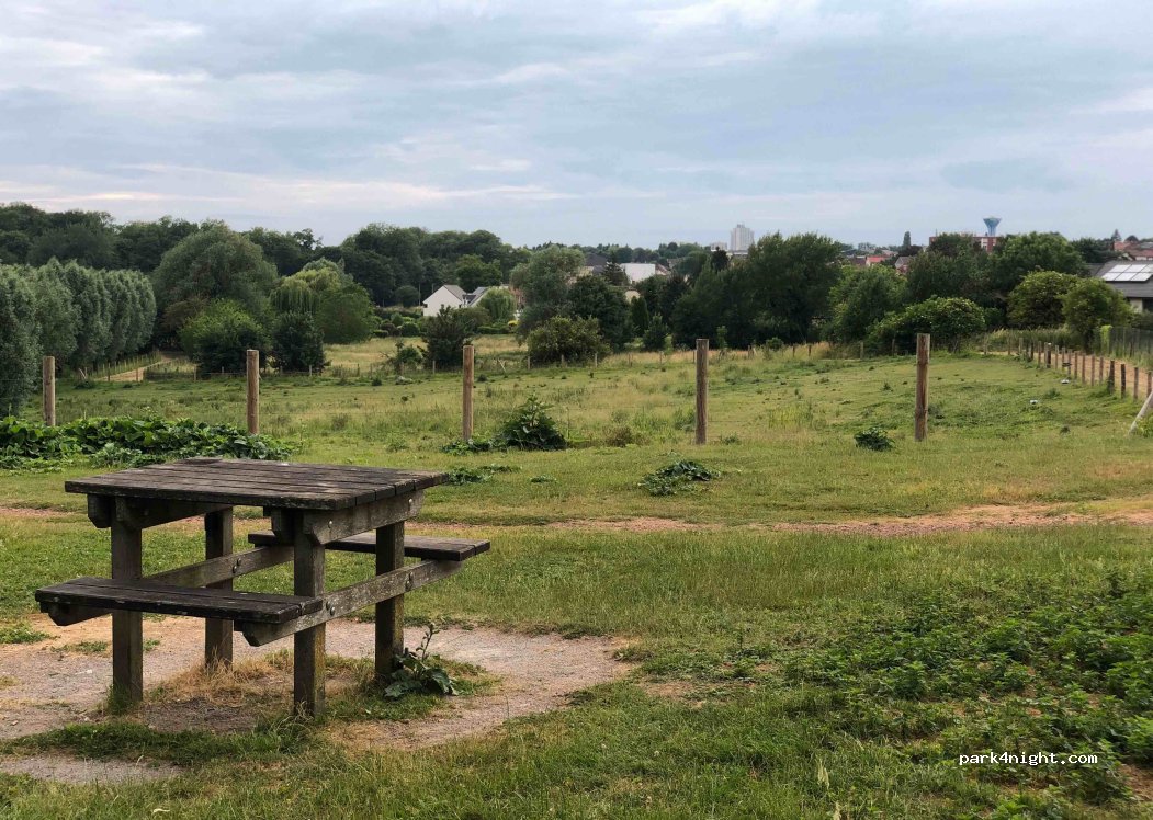 Petit coin tranquille avec 3 tables de pique-nique, jolie vue, chevaux, vaches,bruit des grenouilles. Route passante et voie ferrée juste à côté