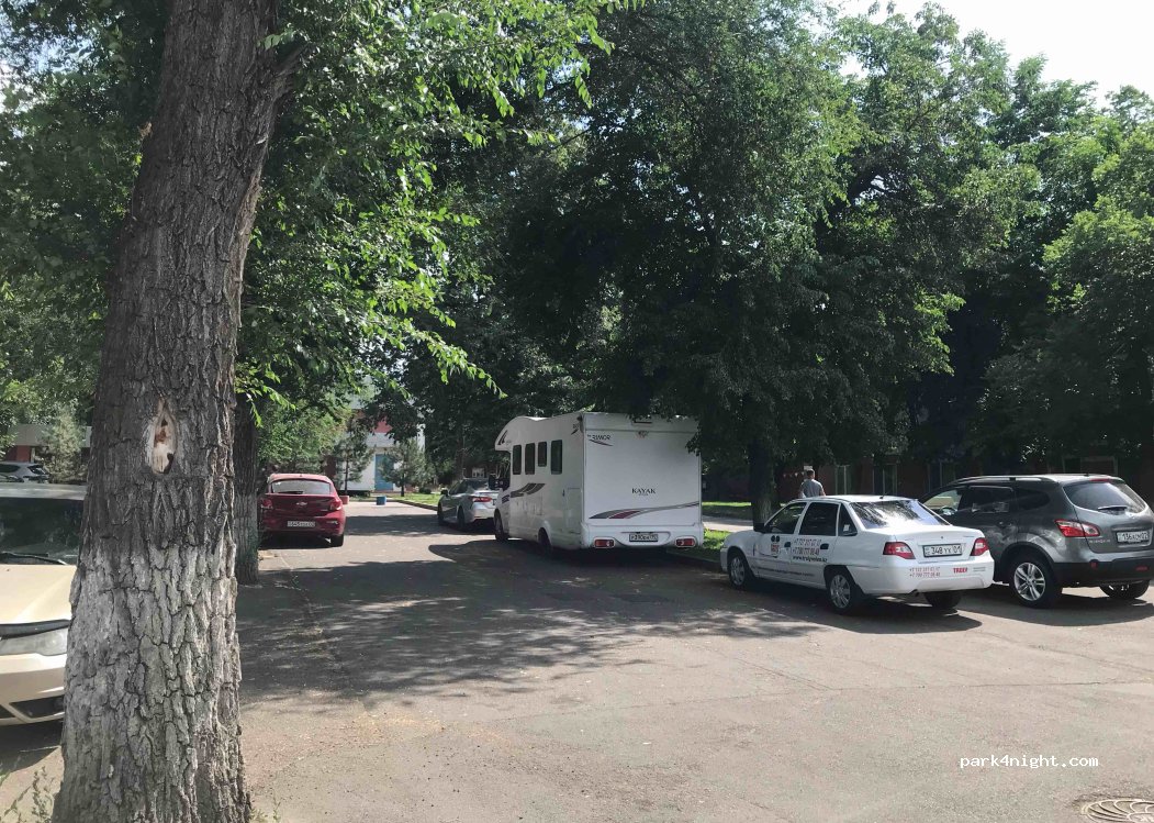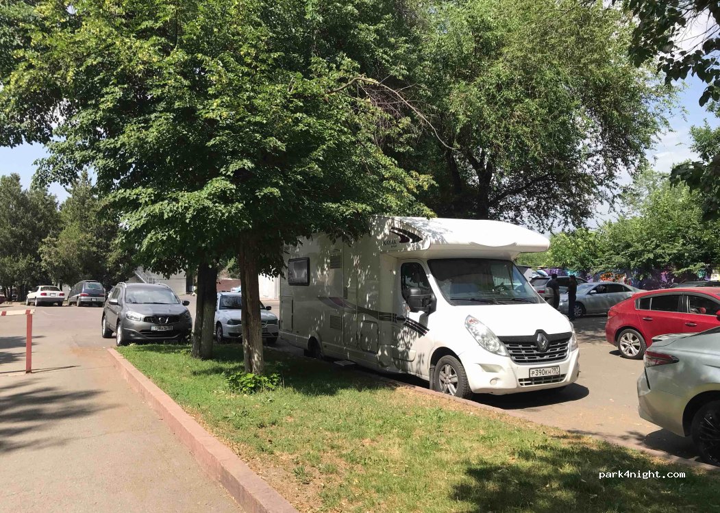Parking by the shopping center, near the park, cafés and shops. There are places under trees, in the shade.