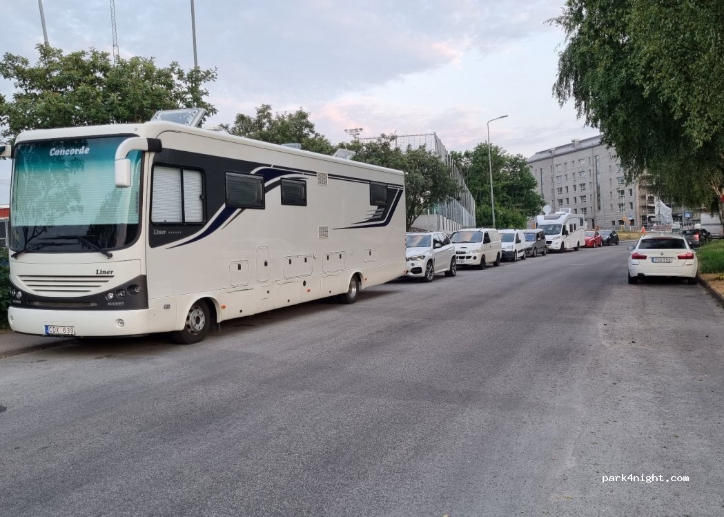 Parkeren langs de weg (Kattegattsvägen) naast een sportcomplex en aan de andere kant een woonwijk. Rustig gelegen voor een nacht, geen voorzieningen.