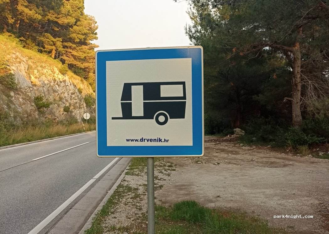 Passamos uma noite tranquila com outras 2 vans, mas é barulhento porque está colado à estrada. Não tivemos problemas. Há um placa azul com um trailer, mas, na minha opinião, ela apenas indica que tem um camping a menos de 100 metros. Acredito que ela não indica "estacionamento autorizado para campervan". Mas dormimos sem problema.