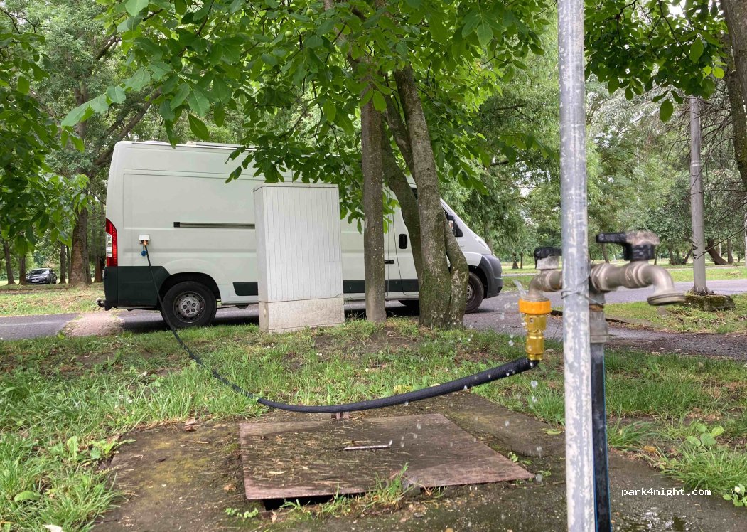Big parking with trees and green grass. Tap nearby. Day parking in summer 1000 Forint per day. Very friendly security, they checked at night if everithing is ok with us.