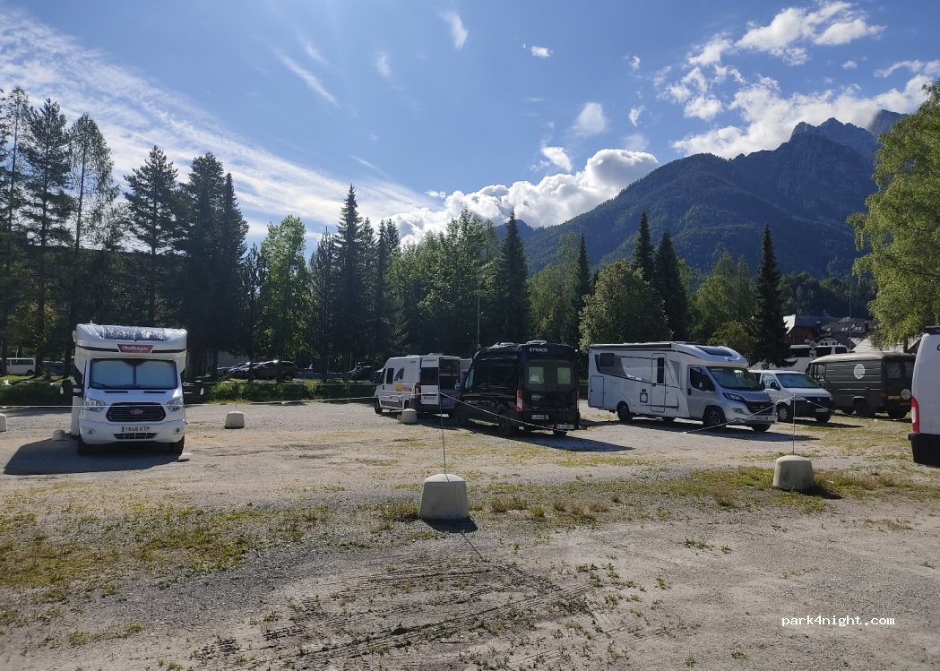 it is what it is, a gravel parking field, 16 euros a night is expensive for no facilities or services, but you're paying for where you are. walk to the lake was lovely along the river. toboggan run was fun.