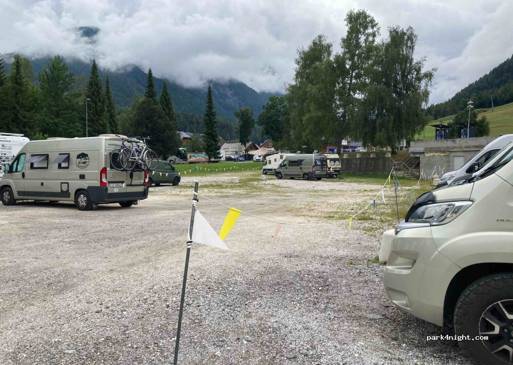Ampio parcheggio sterrato giorno e notte per camper nel centro di Kranjska Gora, di fianco all'arrivo della pista ciclabile. 24€ per tutto il giorno oppure 2€ l'ora. Più avanti, sempre accanto la ciclabile, altri parcheggi ma lì è vietato stazionare la notte.