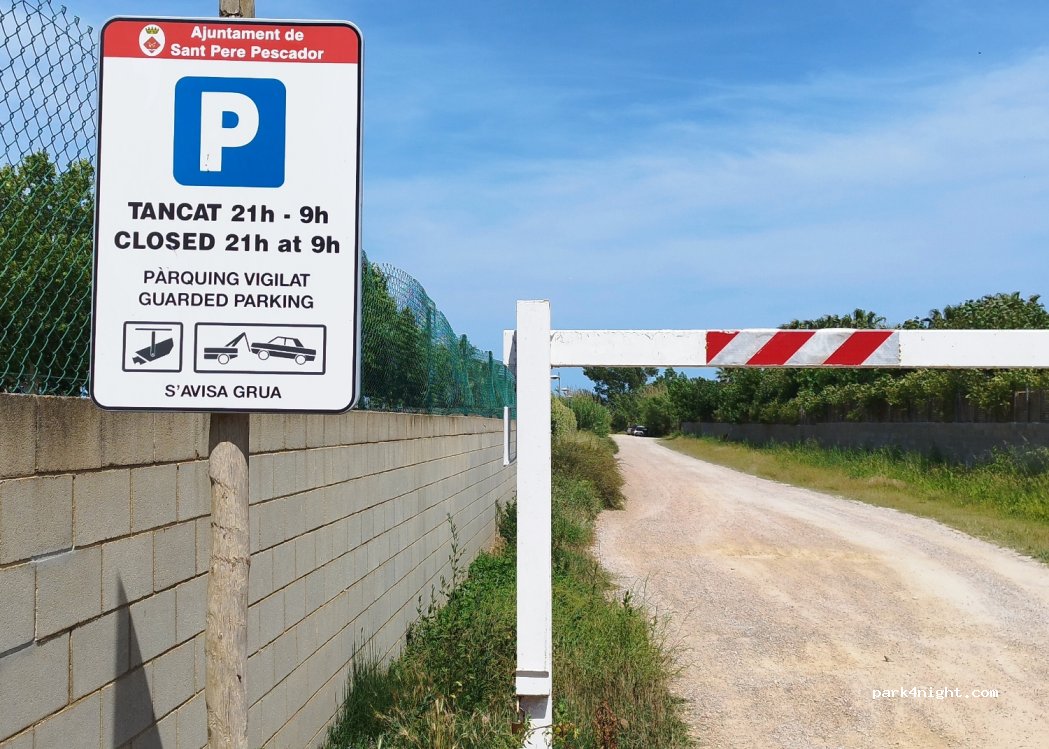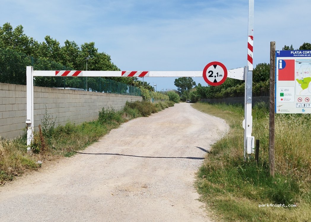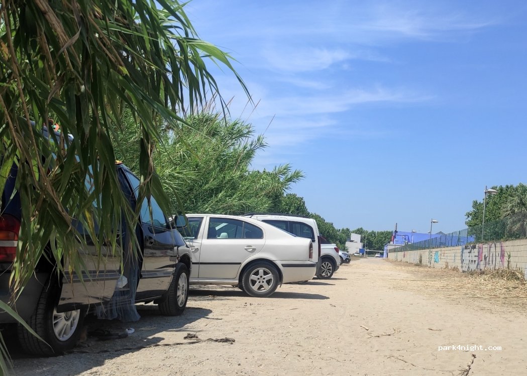 Camino de tierra detrás de la discoteca fata, lugar amplio donde pueden aparcar 5 o 6 furgonetas tranquilamente, no tiene ningún servicio pero está a cien metros de la playa.