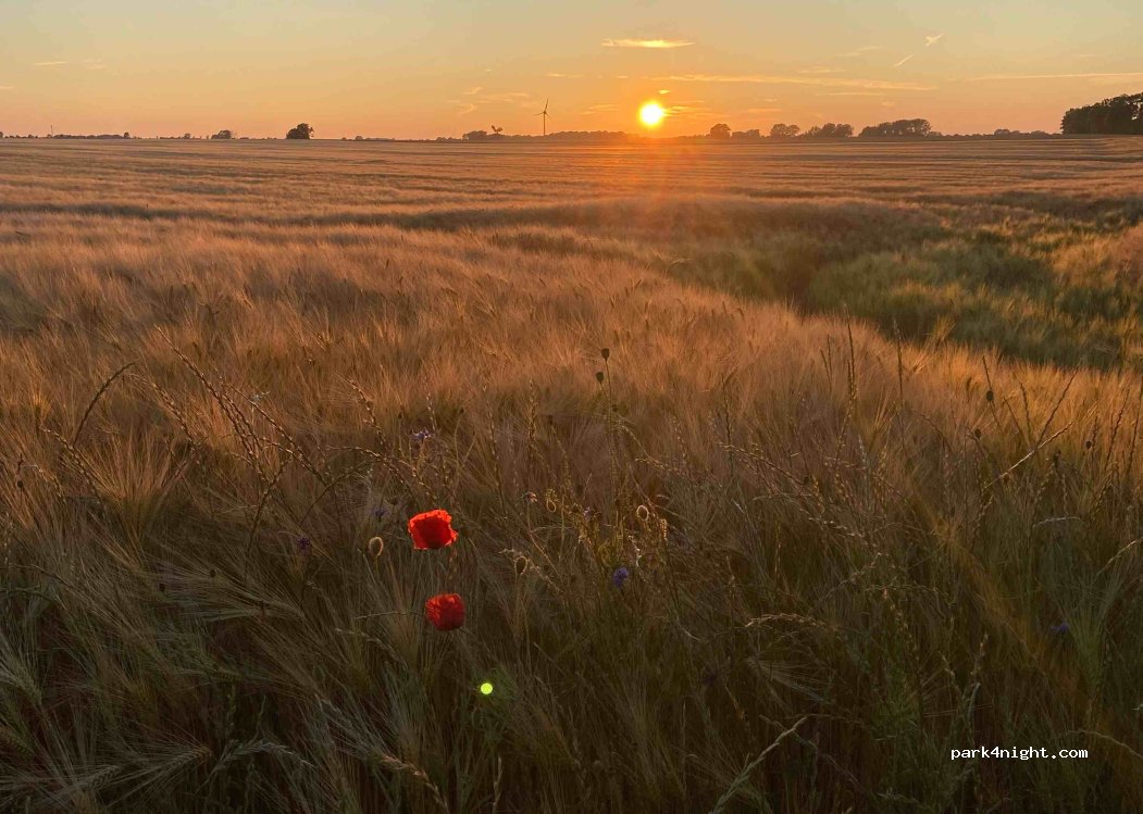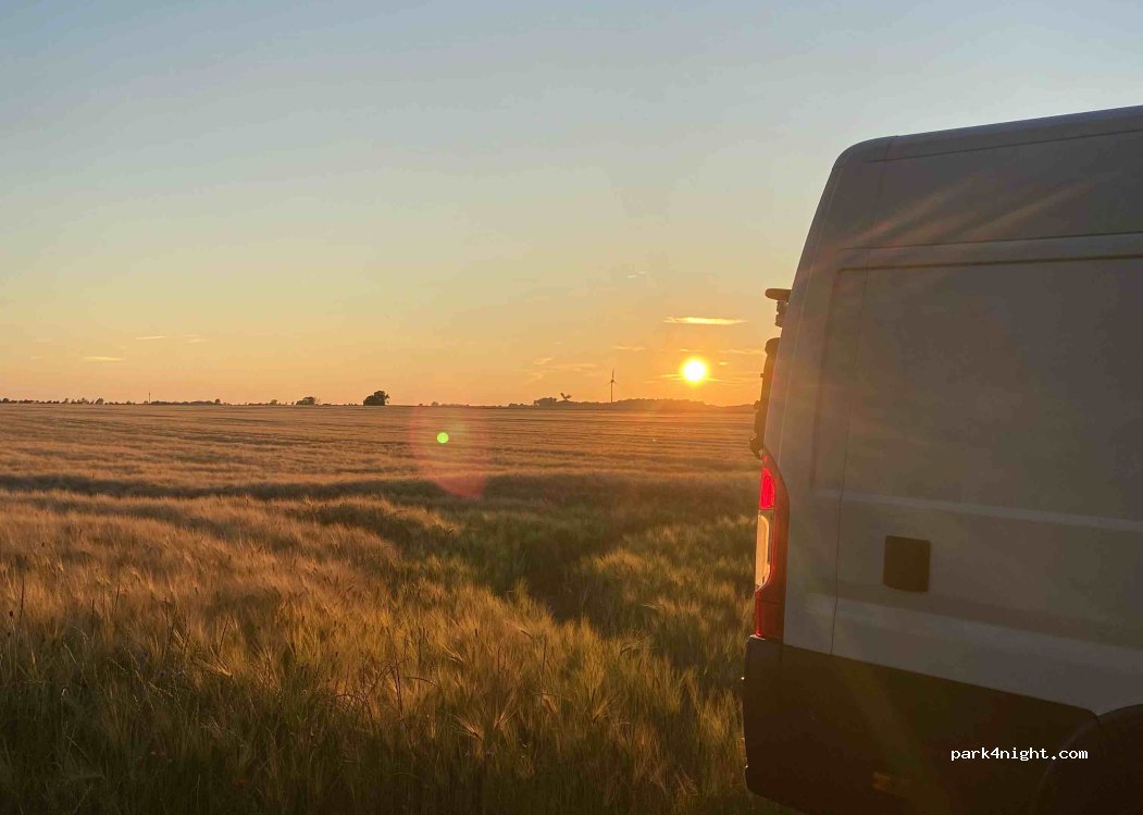 Ein ruhiger Platz abseits der Landstraße, umgeben von Feldern und schwer einsehbar. Landwirtschaftlicher Verkehr frei, keine direkten Anwohner. Wir standen hier ruhig für eine Nacht; am Morgen gab es diverse Radfahrer und Autos, die Kopfsteinpflaster-Weg entlang fuhren.
