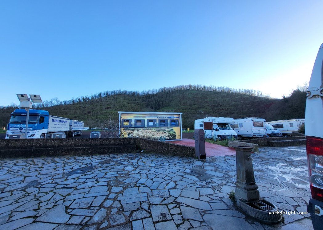 Très grand parking en bord de route dans un petit village. Fontaine sur la route sur arrêt de car qui permet de faire le plein gartuitement