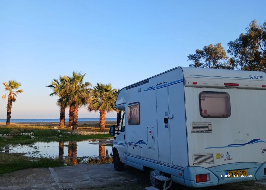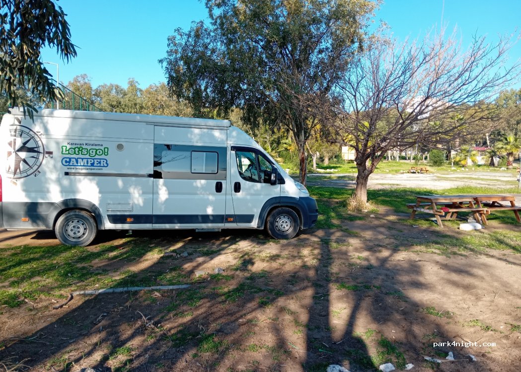 OK it’s on the beach but the area is very sandy so be careful where you drive. Lots of mess and rubbish. Currently digging holes etc so a bit noisy. Difficult to find shade as most spaces filled by permanent caravans. There is water and all disposal and the men on the gate are very helpful. Now 600tl per night. Convenient to walk to shops and restaurants.