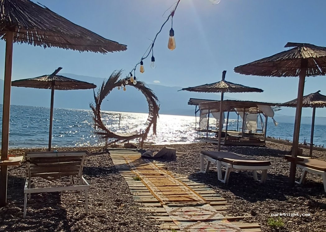 Für nur 15 Euro inkl. Strom ein mega Platz direkt am Ohridsee. Coole Betreiber und alles unkompliziert. Schöner Strand mit Liegen und Bar. Restaurant mit gutem Essen.