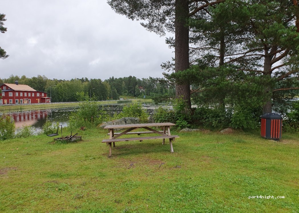 Place plus grande au bord du lac avec plusieurs possibilités de stationnement, table de pique-nique, aire de barbecue et toilettes (100m). Sur le chemin du centre, vous passerez devant une autre toilette et une évacuation des latrines. Au centre, il y a une station-service, un guichet automatique, un supermarché, deux restaurants et une boulangerie. Plusieurs randonnées à pied et à vélo commencent à Hembygdsgården.