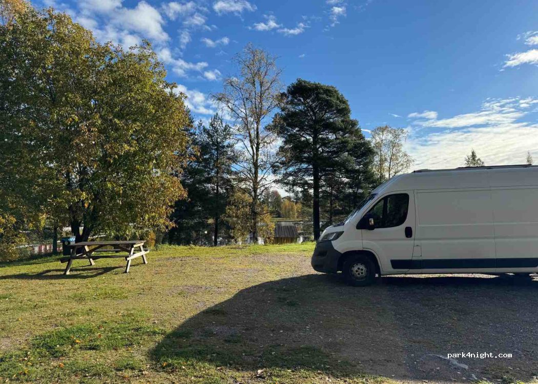 Larger place at the lake with several parking possibilities, picnic table, barbecue area and toilet (100m). On the way to the center you will pass another toilet and a latrine disposal. In the center there is a gas station, an ATM, a supermarket, two restaurants and a bakery. Several hiking and cycling tours start at Hembygdsgården.