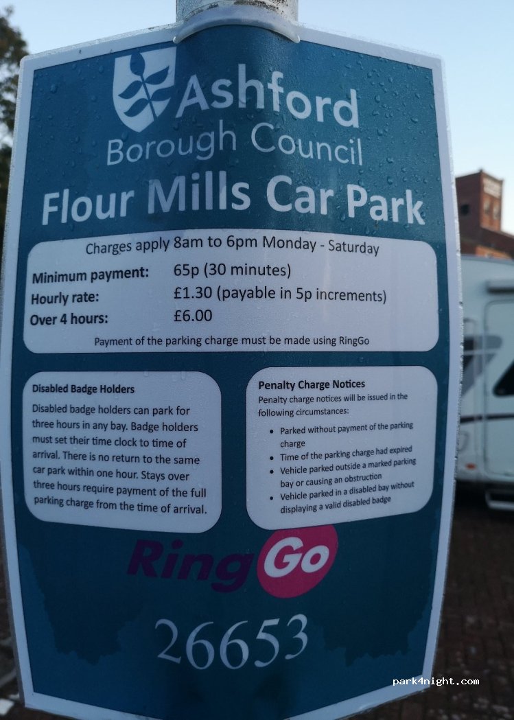 There is a weight limit of 4tons for the bridge, so be careful of that, but we easily got out A class through the entrance. The Carpark was virtually empty, and there’s cctv, which is good. The town high street was 5-10 min walk. There were 2 very long bays, which we easily could fit in. We only stayed an hour in the end, as the town is not what we were expecting… but the park up is good.