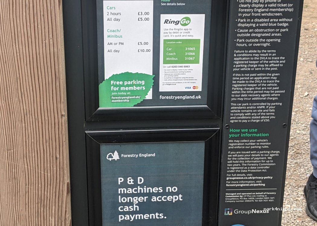 Nice place to visit there's a UFO trail about 3 miles long great for dog walks mountain bike also kids play ground as mentioned toilets also coffee hut. no bins £5 per day £3 for two hrs