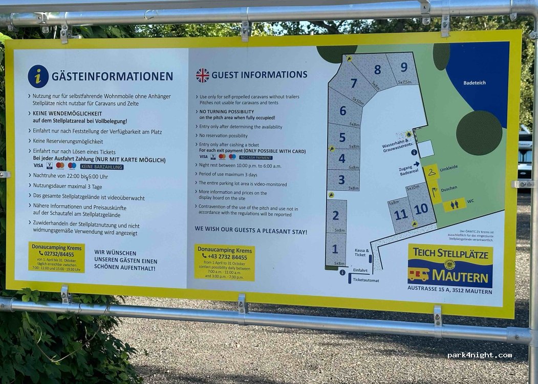Teich Stellplätze Mautern, Krems, het hele jaar geopend, maximaal 3 dagen, camperplaats naast een zwemmeer met bar, vlakke plaatsen met asfaltgrind. Naast de parkeerplaats van het sportpark.