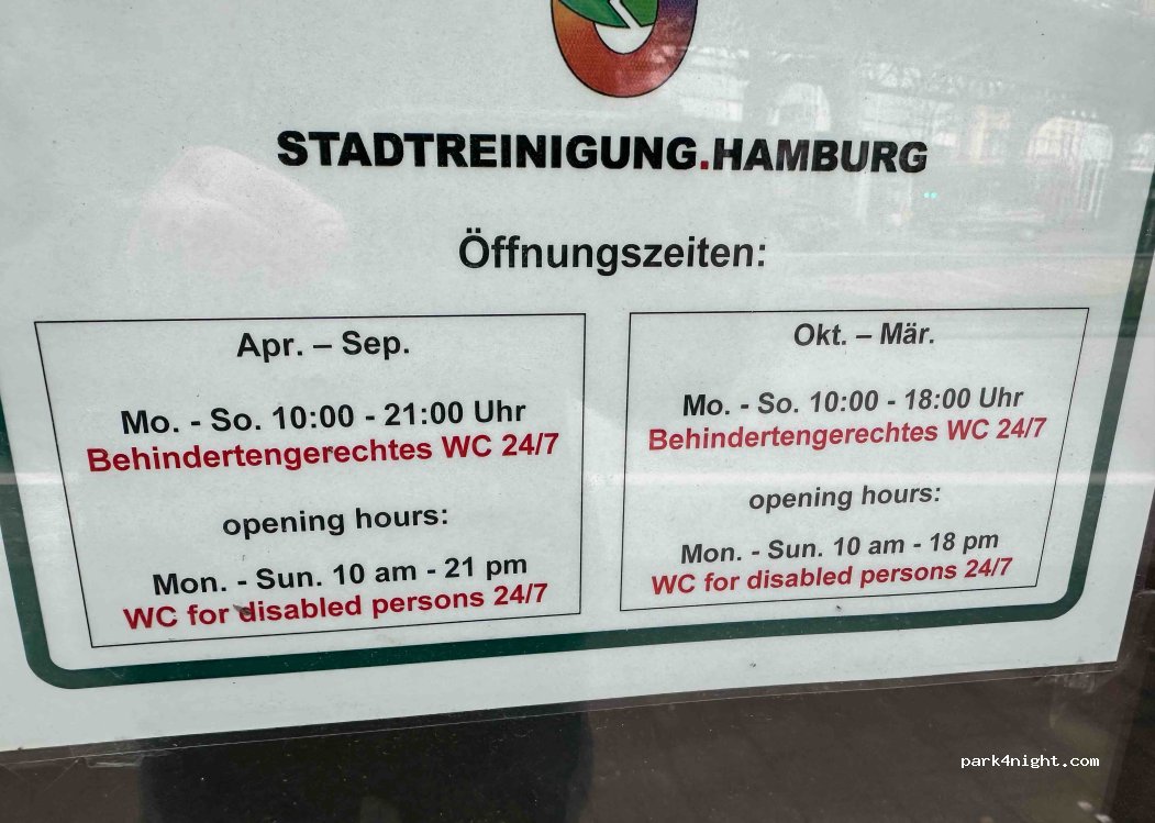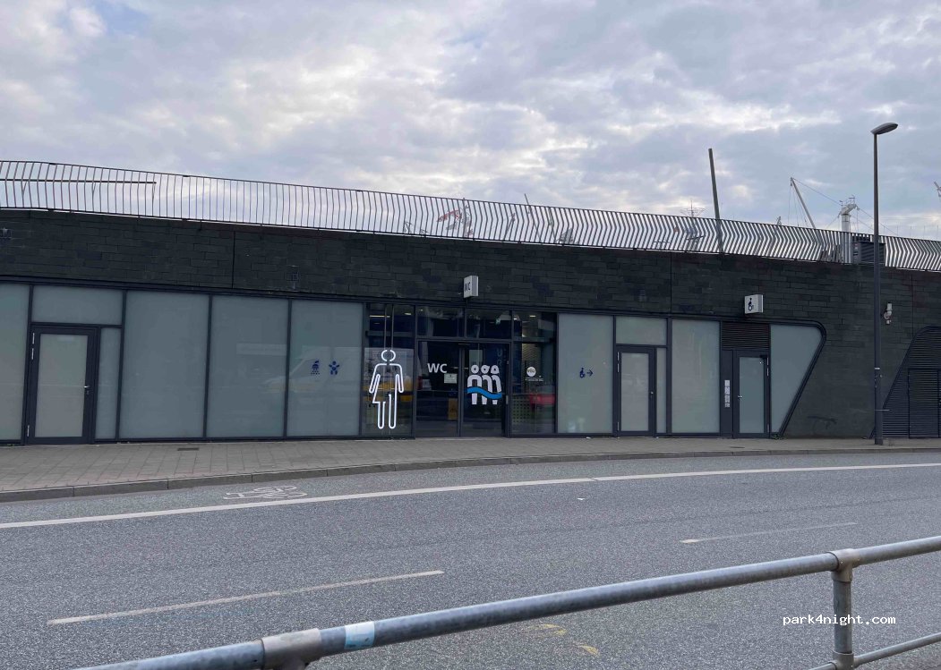Sehr sauber. 5€ inkl Seife u Badetuch. Auch Toilette u Wickeltisch mit drinnen. Befindet sich auf der inneren Seite des Boulewards von ser Strasse aus. WC Schildern folgen. 10-18 Uhr (30 Min vorher wird gereinigt) Im Sommer ab 1.4. 10-21 Uhr (bzw 20.30) Zahlung Bar oder Karte. Wenige kostenpflichtige Parkplätze gegenüber (nicht vangeeignet). Fussweg vom alten Elbtunnelstellplatz 5 min.