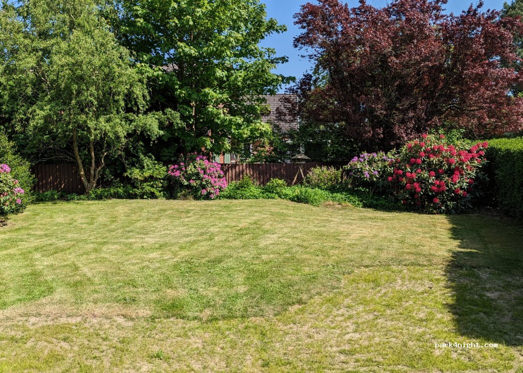 1. Stellplatz im eingewachsenen Vorgarten eines leerstehenden Einfamilienhauses am Dorfrand im Naturpark Aukrug. Südwestlage mit Abendsonne.