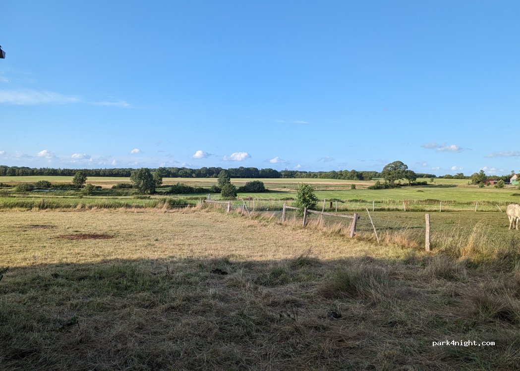 2. Befestigter Stellplatz hinter dem Haus auf der Pferdeweide mit Panoramablick Richtung Nord-Osten.