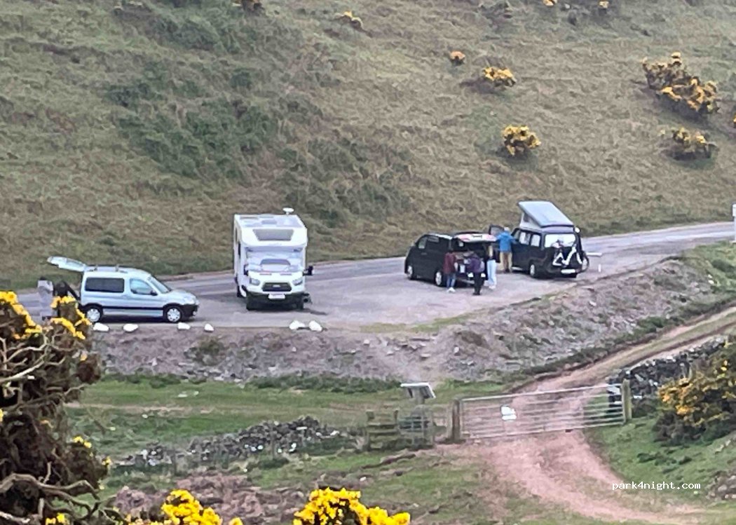 Good overnight stop. Gravel Car park for Siccar viewpoint. Not all flat but 1 or 2 flat positions are possible. Quiet and peaceful, no one else around. There is a warehouse further down the road so lorry’s start coming past 7am but didn’t disturb us. Seemed fairly unused apart from walkers and people going to fish for the day. No services but a lovely find and great for the morning dog walk next day.