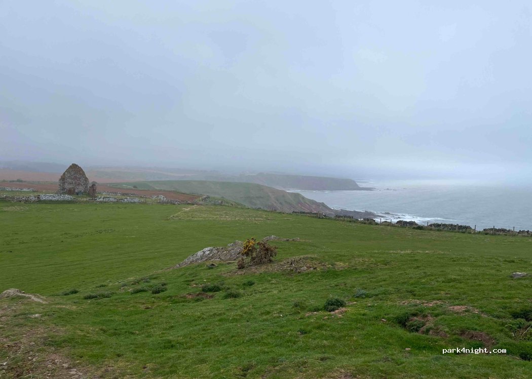 Flattish layby. Few HGVs pass from veg plant. Quiet night. Workers meet for a smoke here before work! Good walks in both up the hill & coastal. Ancient church ruins. I got here via a ford & twisty road from Pease Bay. Do not go that way...