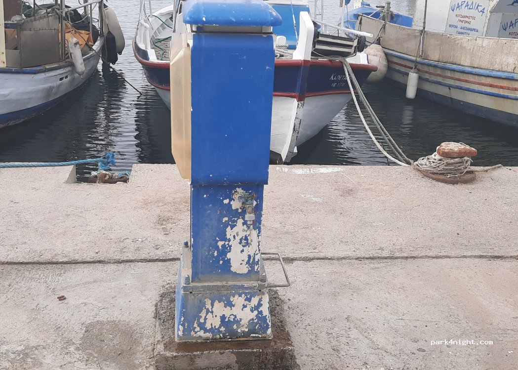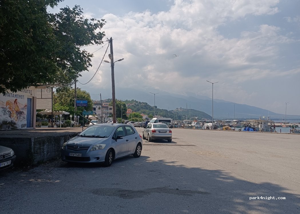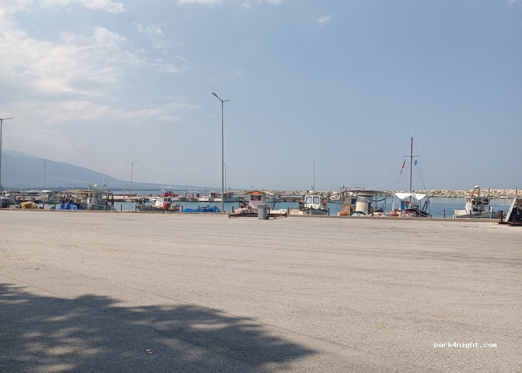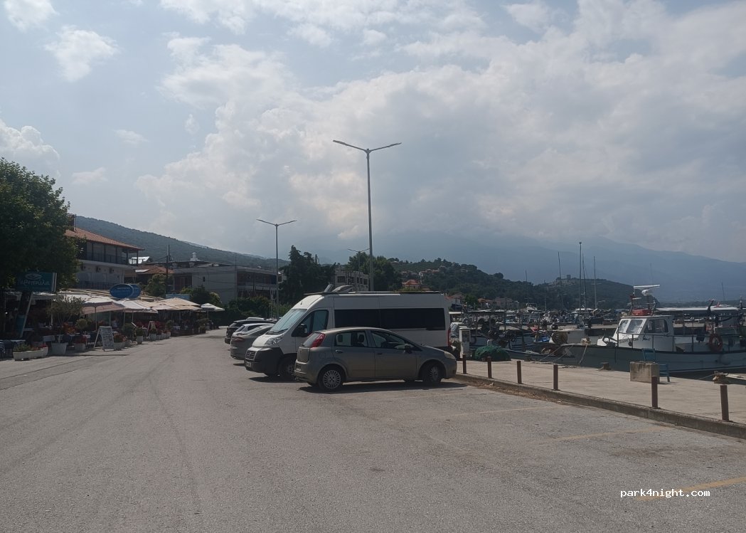 A nice town with a decent parking area next to the boats. Good place to stop after visiting the Mount Olympus area. If you have a smaller van there's potential for shade. Quite quiet even in July. Nice local cafes and restaurants. Be discreet - don't litter or dump waste/toilet or put chairs/table etc out. Respect and enjoy the peace and quiet :)