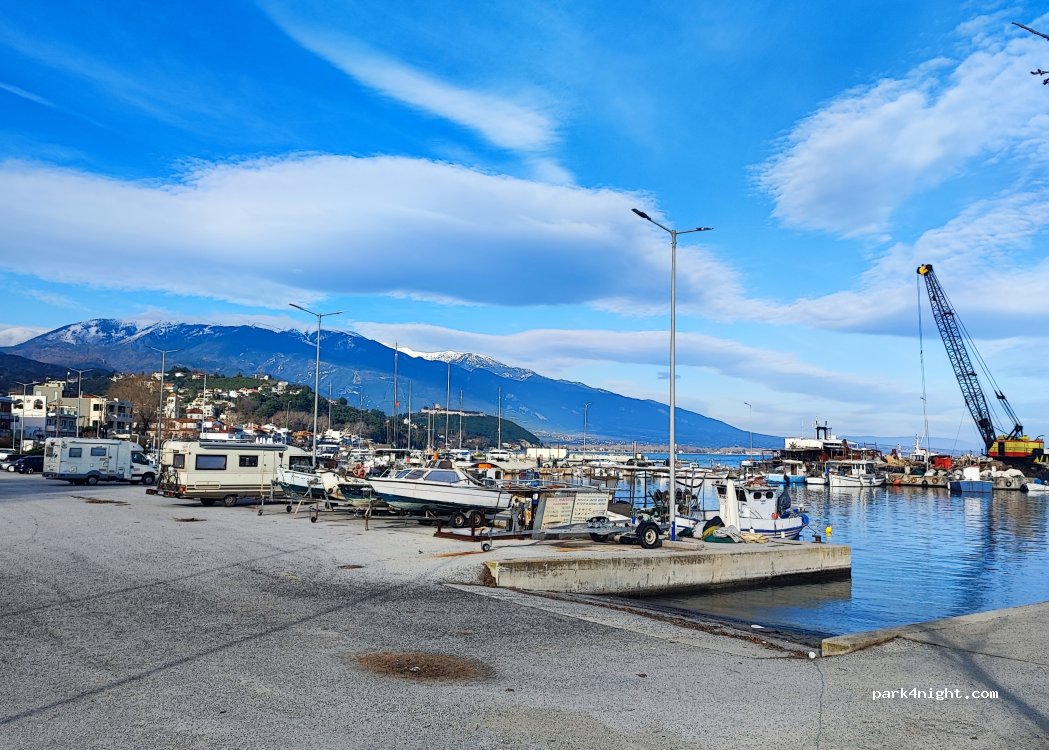 Une belle ville avec un parking décent à côté des bateaux. Bon endroit pour s'arrêter après avoir visité la région du mont Olympe. Si vous avez une camionnette plus petite, il y a un potentiel d'ombre. Assez calme même en juillet. Bons cafés et restaurants locaux. Soyez discret - ne jetez pas de déchets ou de toilettes ou ne mettez pas de chaises / table, etc. Respectez et profitez du calme et de la tranquillité :)