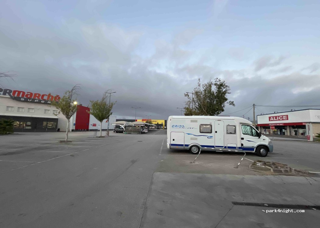 Parking intermarché, parfait pour ravitailler. Vidange eaux usées et remplissage gratuit. Stationnement sut le parking autorisé pendant 24h.