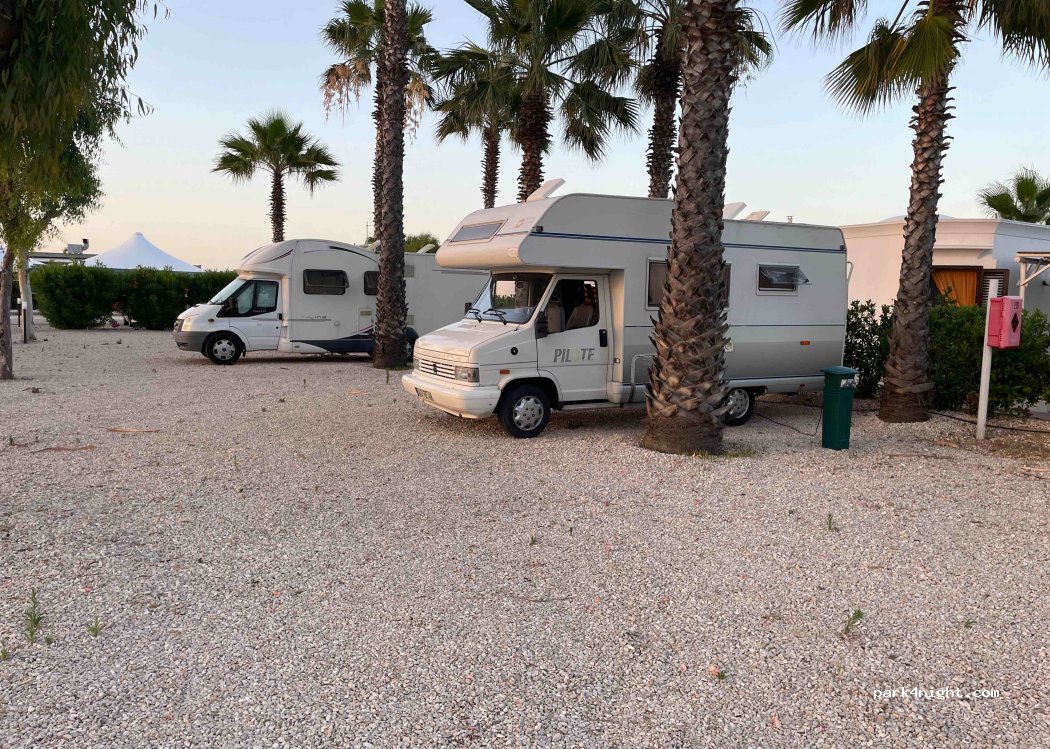 Big parking lot with gravel and palm trees beautifully placed at the lot. Very close to the beach. Cost 30 euros per night, the beach can cost upwards 25 euros per day. You have to pay to shower (1 euro per 2 min). There is a restaurant, but the kitchen closes at 3:30pm. Too expensive to be worth it. Be careful with the gate closing if you leave at night to get food for example. 2/9 2023