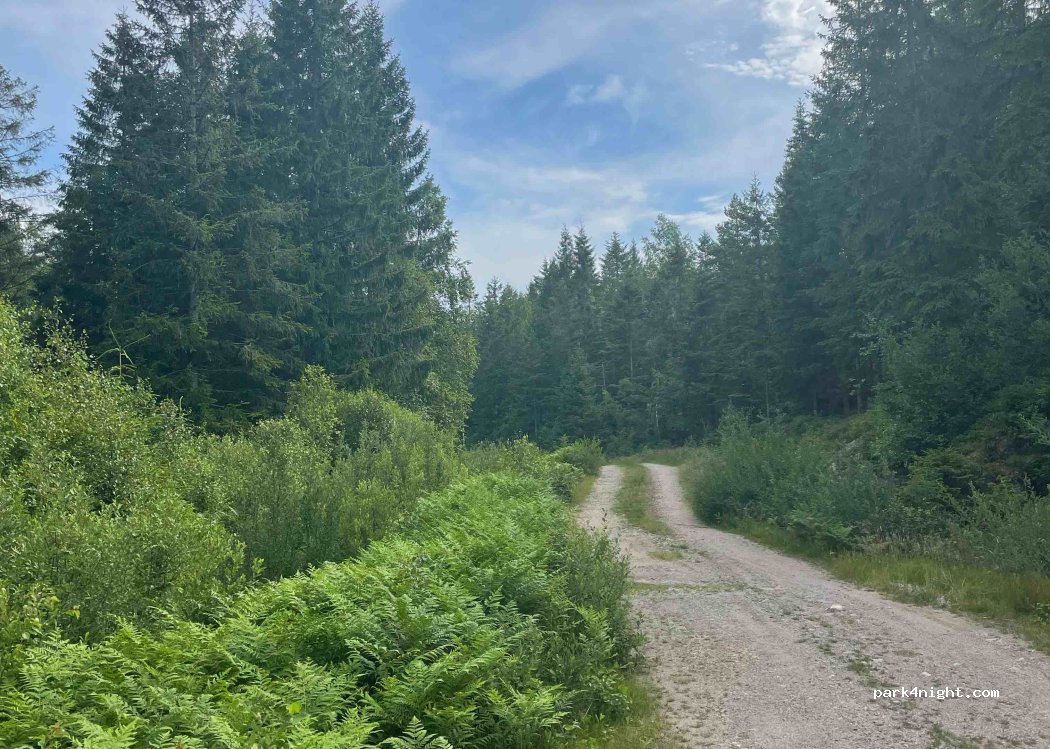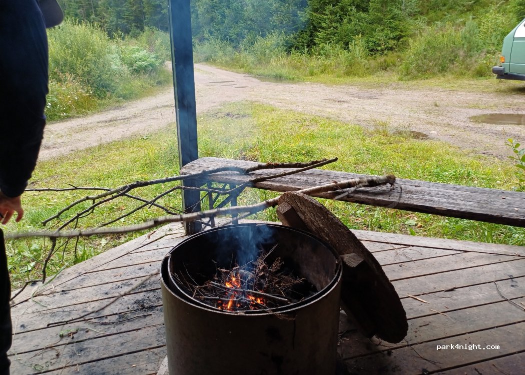 lovely very remote spot in the middle of the forest. it's a 10km drive down what starts out as a single track tarmac road and changes to gravel path. when you turn off to park, it changes to a smaller bumpy dirt road. only suitable for smaller vans. wooden shelter with a fire pit. perfect for shelter and keeping mozzies away. We had it all to ourselves.