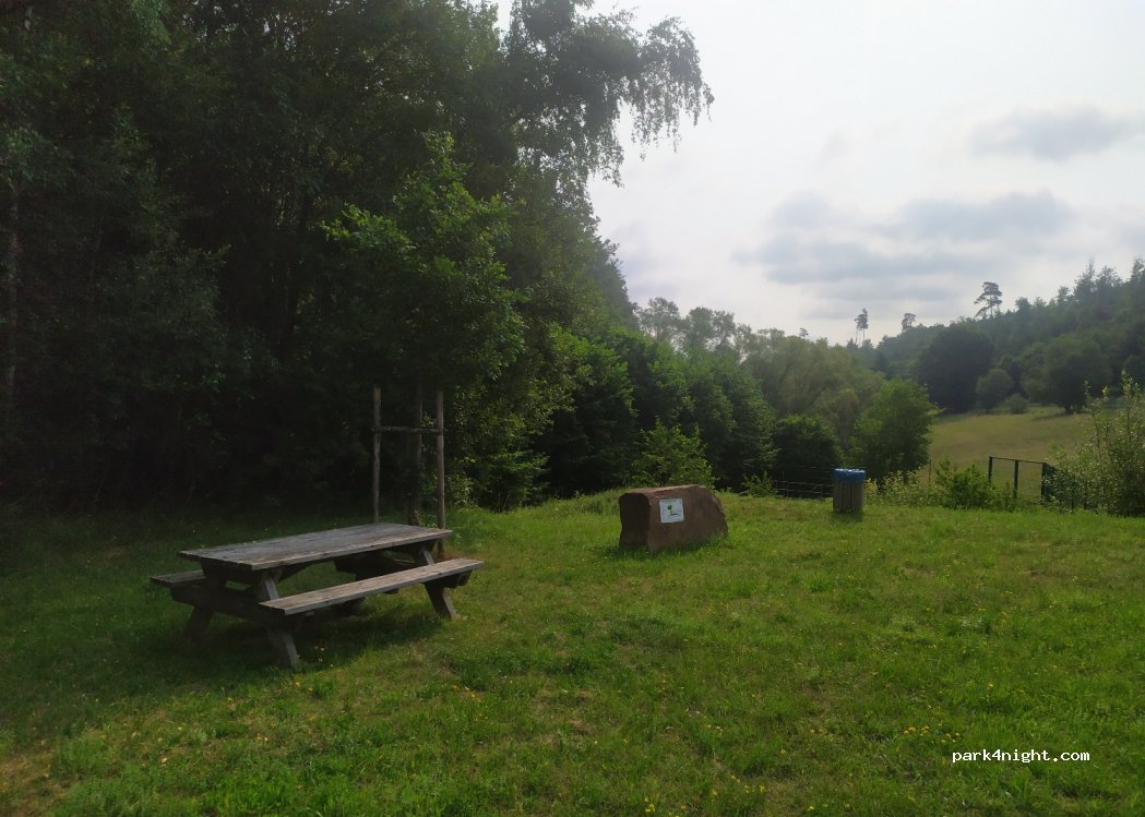 Ein schöner Stellplatz mit Sitzgelegenheit und Mülleimer, der Platz etwas sehr schräg, dafür sehr ruhig, nur Natur.