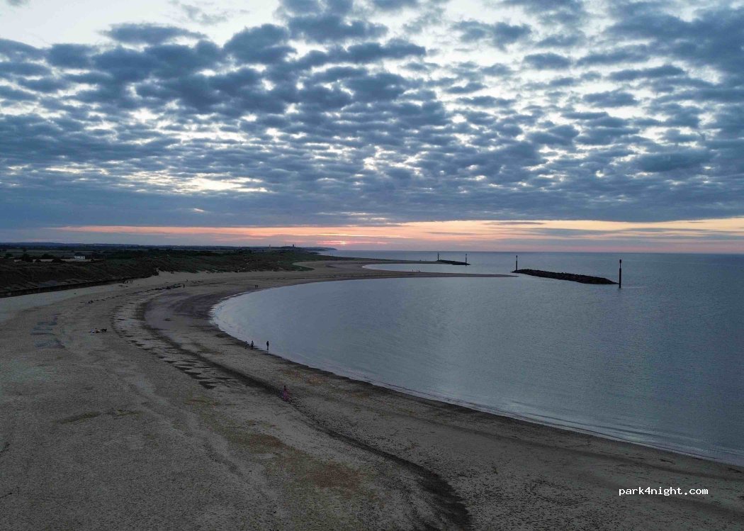 Great place, parking signs says no overnight sleeping, was 4 on a Saturday night. Very large grass car park gets really busy in daytime as gorgeous beach just over sand dunes. On the Sunday morning we saw the council parking van checking tickets on car but didn’t come over to any of the MH so think as long as you leave no trace you’ve stopped they turn a blind eye. Was a very peaceful night