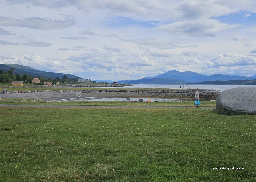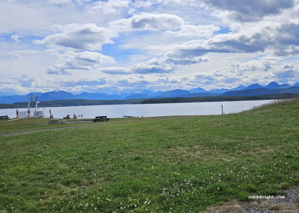 Nautischer Stützpunkt mit Picknicktischen und großem Parkplatz für Wohnmobile.