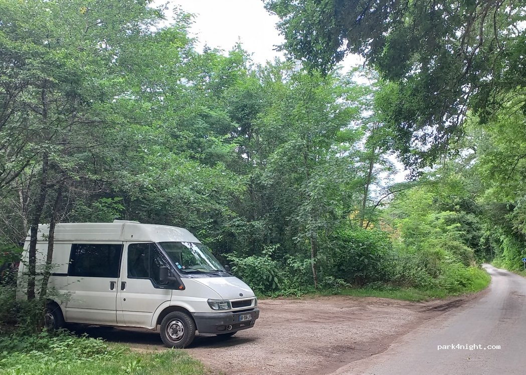 parking pas très glamour mais résurgence très jolie à 2mn à pied pour manger devant, places ombragées. Bord de route mais très très peu de passage. Très bien pour une nuit tranquille.