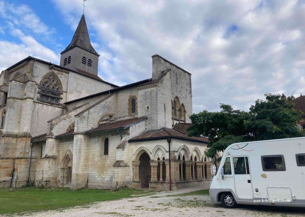 Parking près de l'église. Vue sur l'église avec un petit espace en pelouse. Point d'eau dernière l'église. Deuxième point pour passer la nuit indiqué par la commune avec celui de l'aire de service.