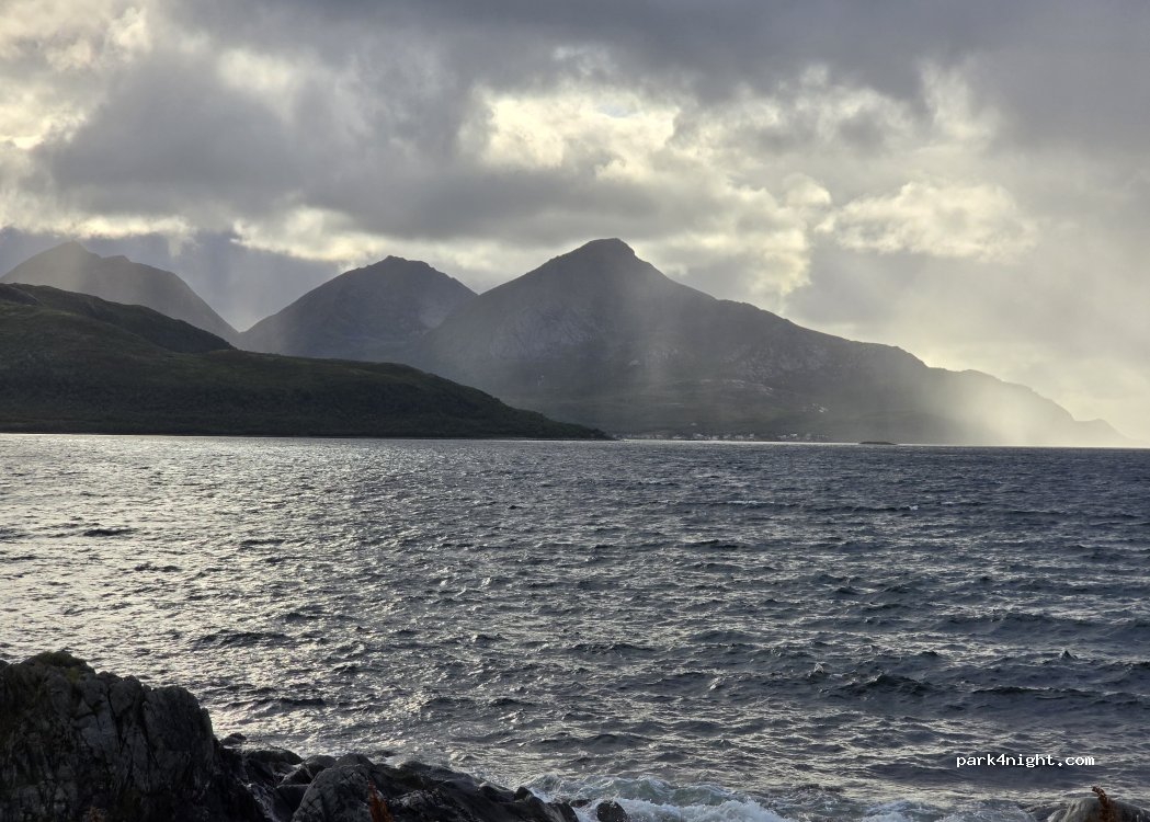 Ein freundlicher, älterer, sehr freundlicher Herr bot uns gleich einen windstillen Platz an, da es bei Ankunft ordentlich gestürmt hatte. Außerdem kam er sofort mit einem Verlängerungskabel, das er uns für die Zeit zur Verfügung stellte. Die Umgebung ist wirklich sehr, sehr schön in diesem Fjord. Er könnte zahlenmäßig mit Dusche und Toilette etwas aufrüsten, es war aber alles picobello sauber.