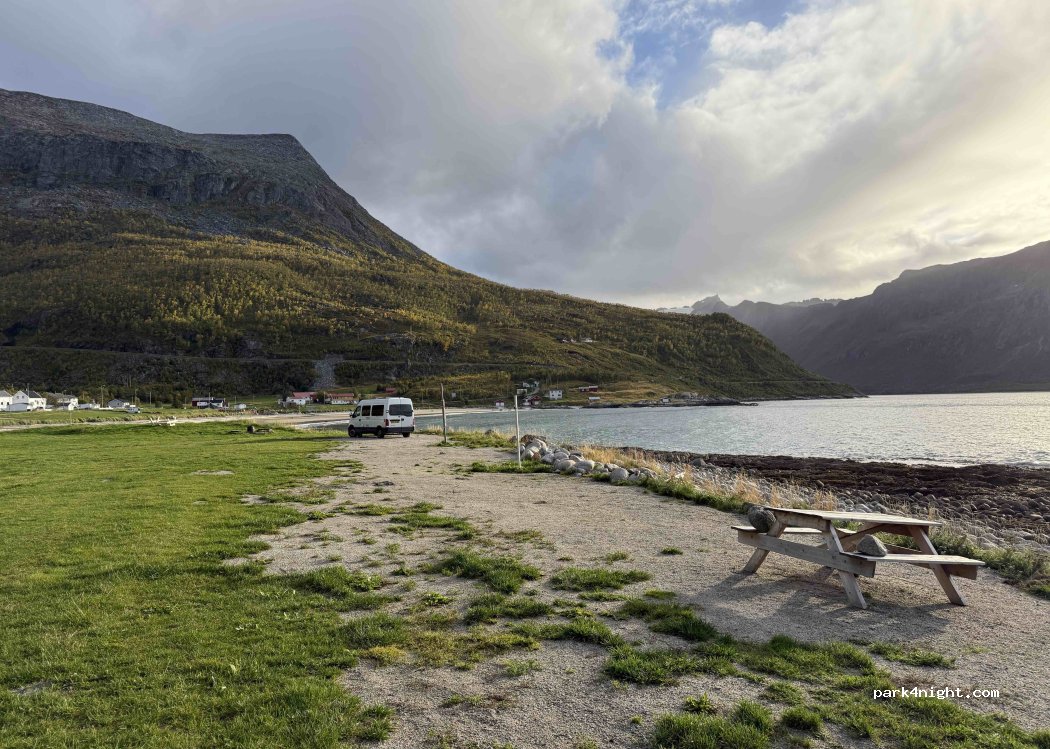 Fantastische plek, met zeer vriendelijk eigenaren!! Je kunt natuurlijk ook 100 meter eerder gaan staan op de beach parkeerplaats/‘camping’ voor iets minder geld, maar wij kozen voor rust, ruimte en natuurlijk het sponseren van de echte locale bevolking!!! 250NOK (2p) en 50NOK stroom (incl het lenen van een lange kabel zodat we ook dicht bij de zee konden staan).
