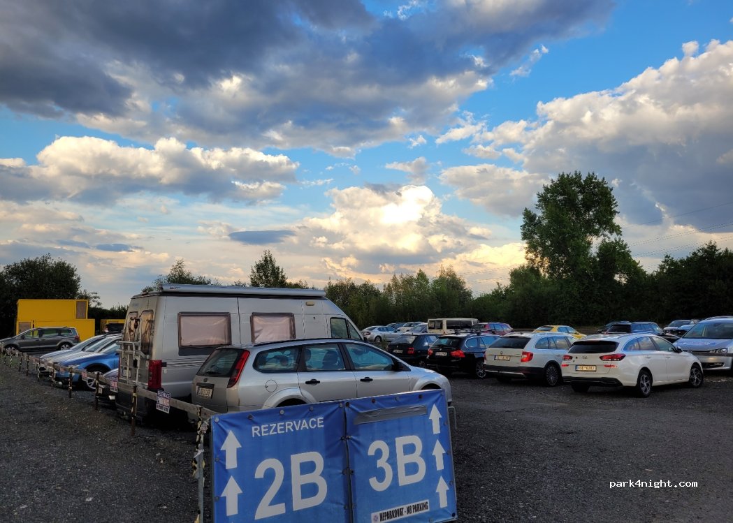Only far small cars in size of VW Transporter. Don't try to park there with bigger and higher RVs cause there are concrete cylidners infront of the entrance and rooftop over it.