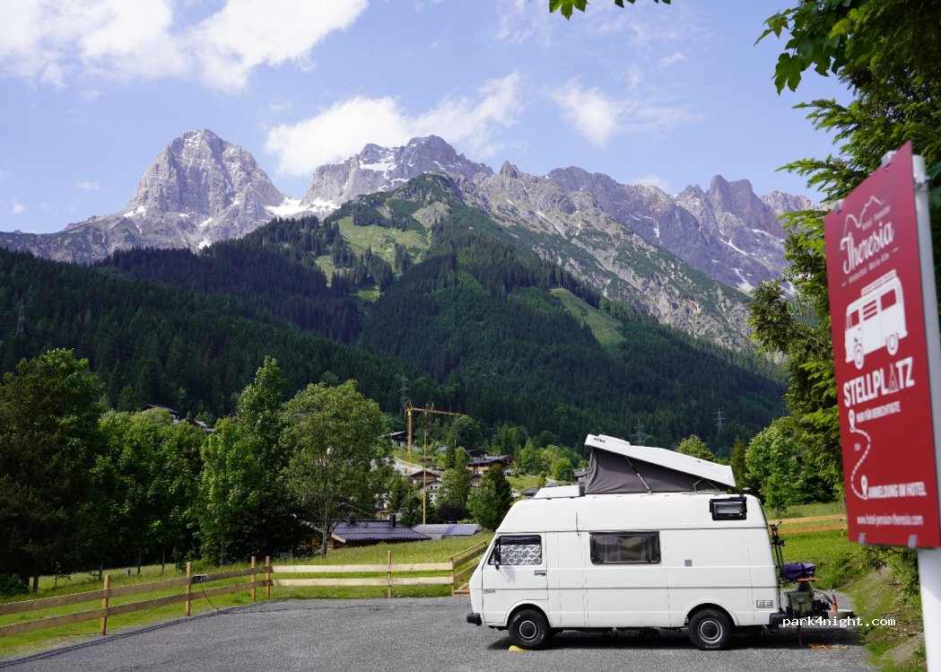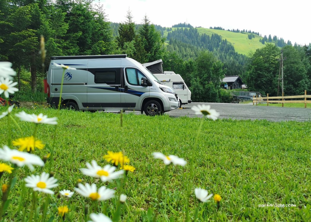 Petit espace pour 5 camping-cars jusqu'à 12 m directement derrière l'hôtel, très chers hôtes. Superbe panorama sur les montagnes.