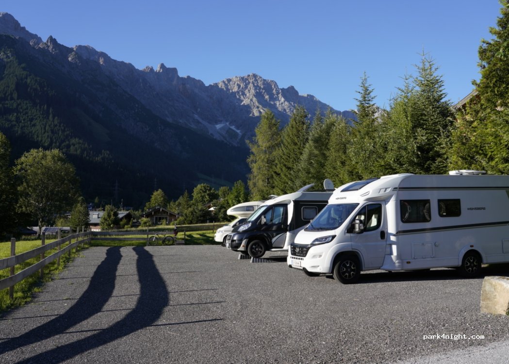 Piccolo spazio per 5 camper fino a 12 m direttamente dietro l'hotel, padroni di casa molto cari. Ottimo panorama sulle montagne.