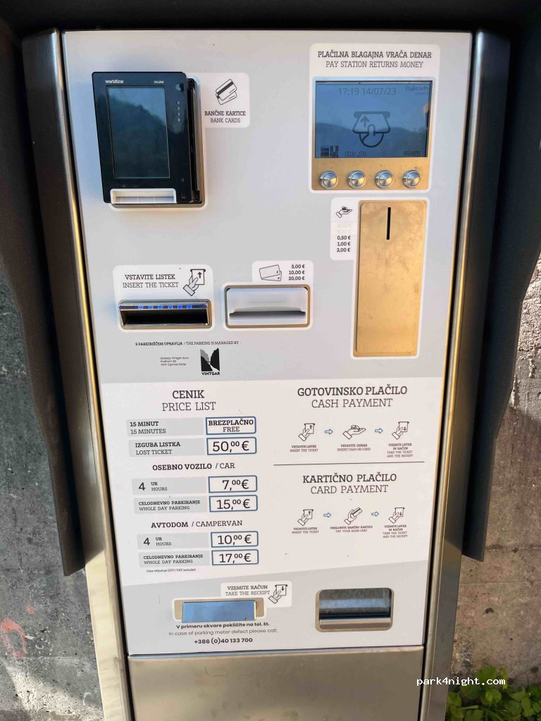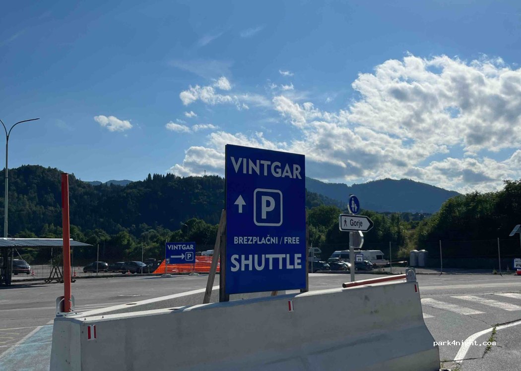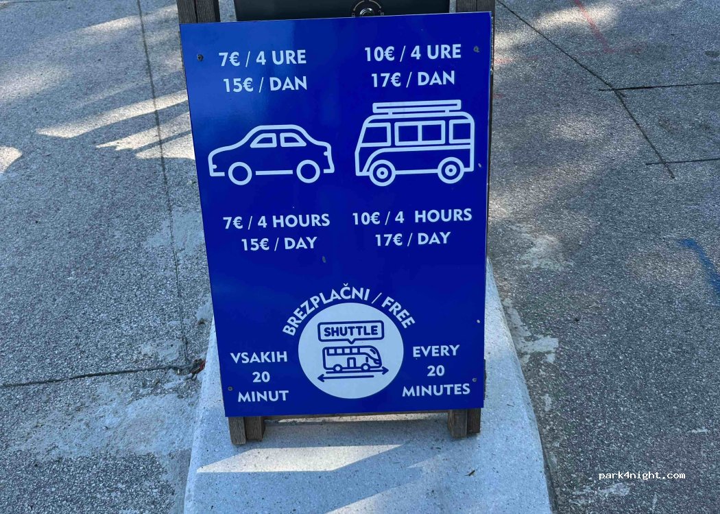 Large car park for cars, vans and motorhomes. Parking for Vintgar Gorge (free shuttle leading there). Lake Bled 20-25 mins walk. Possibility to pay in cash or by card.