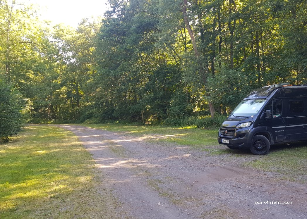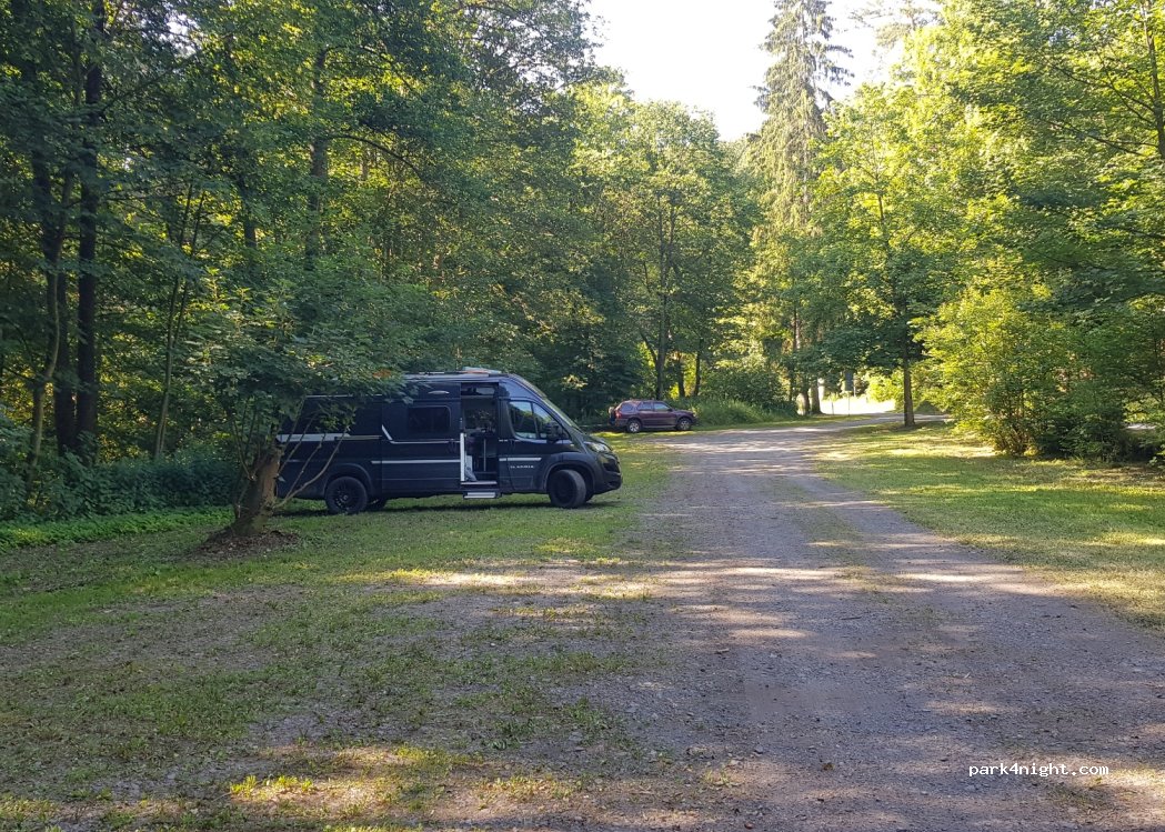 Relatively large hiking car park without restrictions for campers. Quite slightly sloping with solid underground. 600m further there is a navigable possibility to launch your boat for a tour on the Saale. A bus stop for the hiking bus is also here.