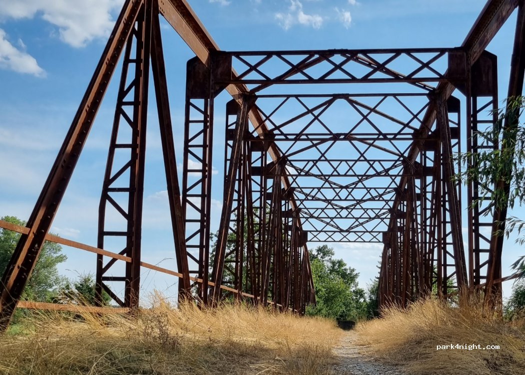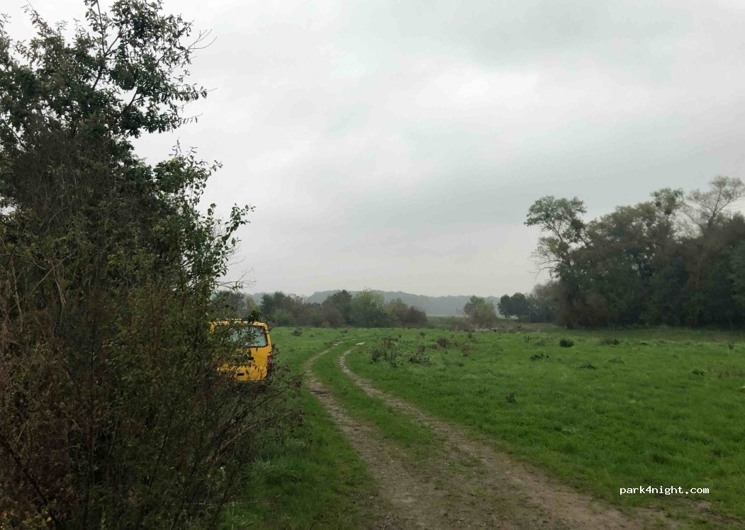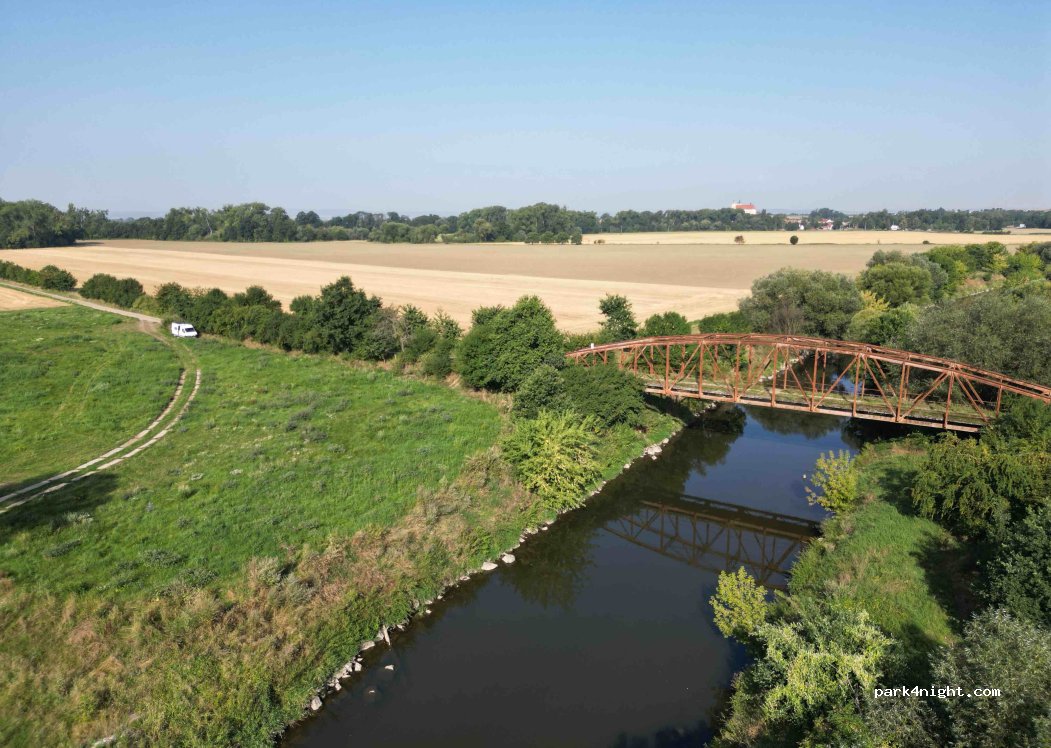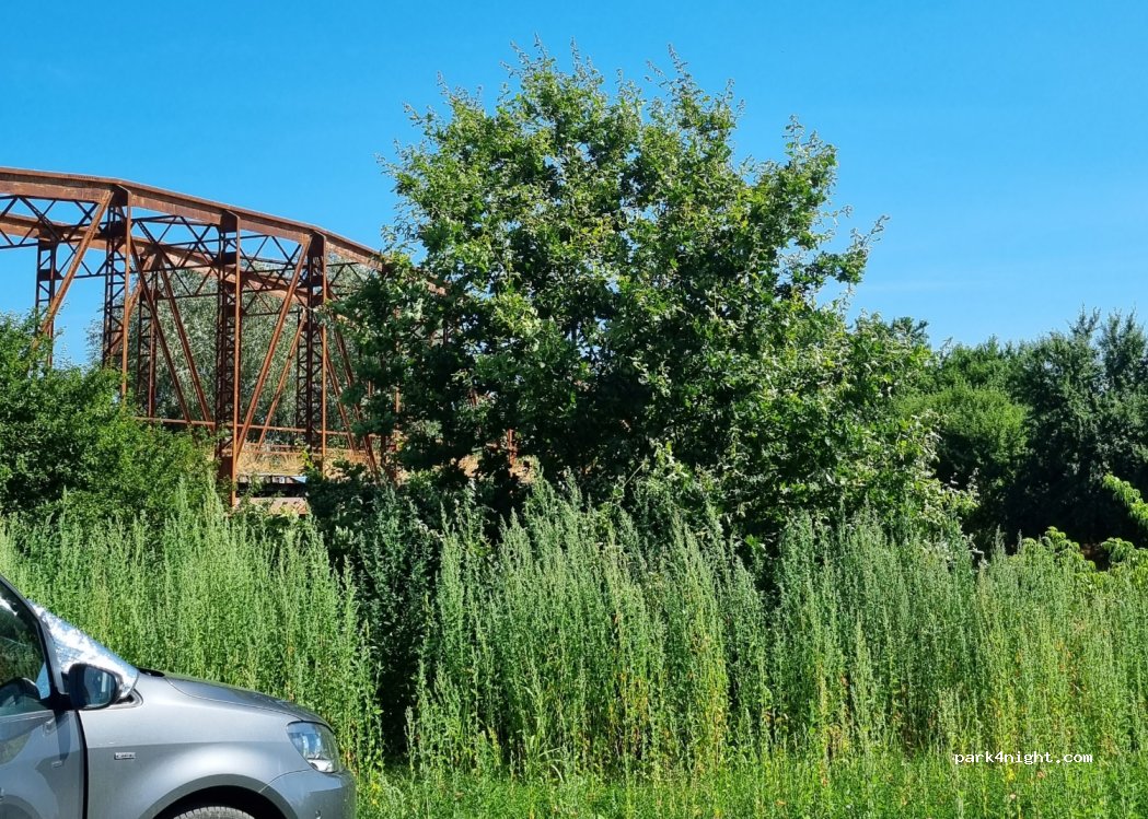 Ruhiger Ort für eine Nacht. An heißen Tagen unerträglich. Die Brücke ist marode und gesperrt, wer dennoch drauf möchte: passt auf! Internetempfang sehr gut. Fluss nicht zugänglich! Teils tiefe Äste die mein Dach streiften (2,7m)