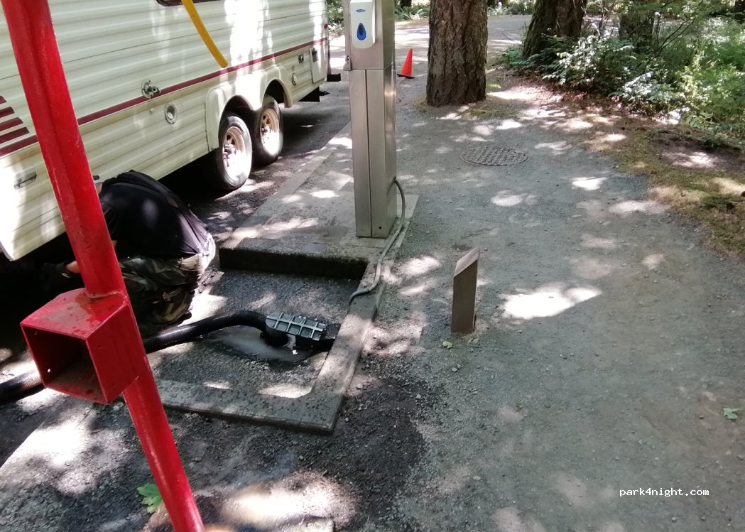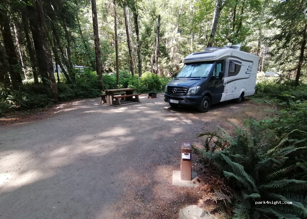 Sehr schöner Platz, nur durch eine wenig befahrene Straße vom Campbell River getrennt. Weit auseinanderliegende Stellplätze unter herrlichen uralten Bäumen. Schön, dass man vorbuchen kann.